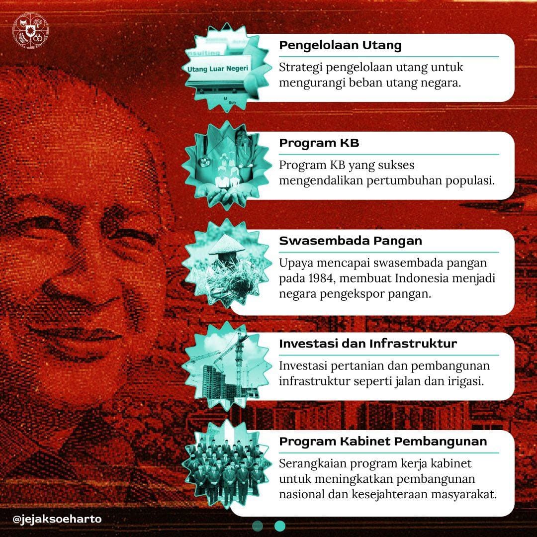 4. Pembangunan Ekonomi dan Pembangunan Infrastruktur: Selama pemerintahannya, Soeharto melakukan berbagai program pembangunan ekonomi dan infrastruktur yang bertujuan untuk memodernisasi Indonesia. Program-program ini termasuk pembangunan jaringan jalan, irigasi, serta peningkatan produksi pangan dan energi.
