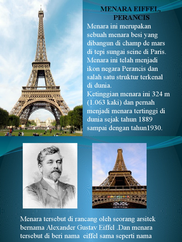 Menara Eiffel, yang terletak di Paris, Prancis, adalah salah satu monumen paling terkenal di dunia dan telah menjadi simbol yang kuat dari Perancis. Menara ini dinamai menurut nama insinyur yang merancangnya, Gustave Eiffel. Menara ini dirancanakan dan dibangun untuk Pameran Dunia Paris tahun 1889, yang diadakan untuk merayakan seratus tahun Revolusi Prancis.